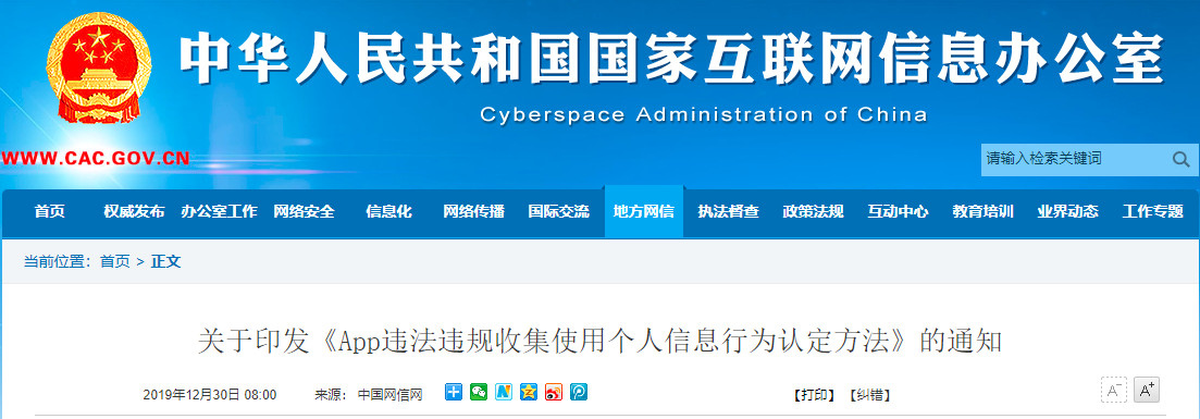 关于印发《App违法违规收集使用个人信息行为认定方法》的通知