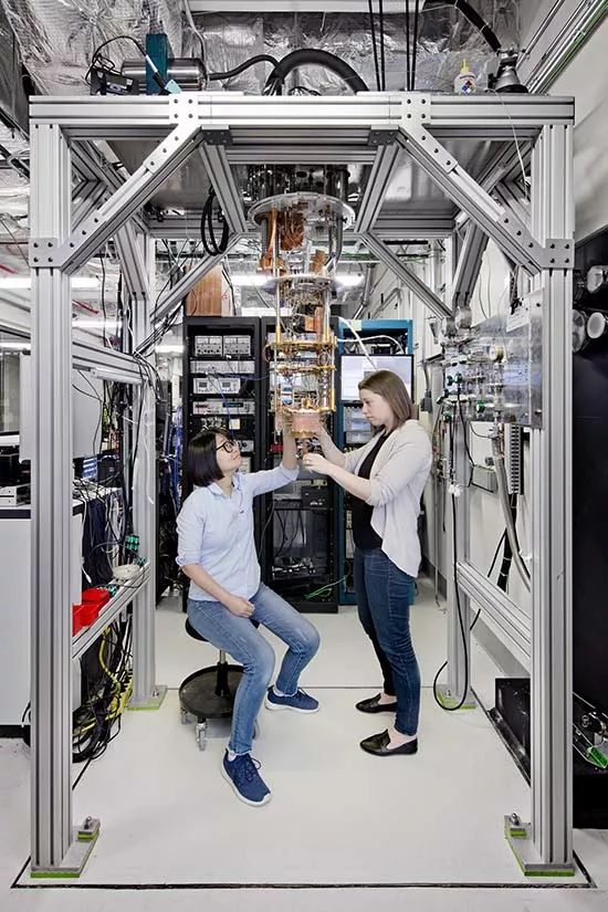 在约克敦海茨托马斯·J·沃森研究中心埃罗·沙里宁风格的空旷外部区域,穿着蓝色牛仔裤的IBM研究员正在组装遵循量子力学规则打造的新一代超级计算机。这些充满未来气息的机器挂在稳定的金属支架上,看起来就像金色的枝形吊灯,或是机器蜂房。这些设备在真空的超低温制冷箱内仿佛魔术般运转着。该技术可谓集智慧与美丽于一身。